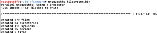 Thao tác này sẽ tạo một thư mục có tên là squallfs-root, thư mục này sẽ được giải nén toàn bộ hệ thống tập tin. Từ đây, giờ đây chúng tôi có thể phân tích các tệp nhị phân riêng lẻ hoặc xem các tệp cấu hình để xác định các lỗ hổng.