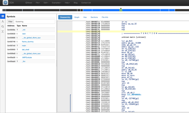 Bạn có thể tháo rời chúng thông qua các công cụ như objdump, IDA hoặc thậm chí là trình dịch ngược trực tuyến. Ví dụ: nếu chúng ta thử tệp nhị phân có tại pwnables/Intro/stack_bof1 trong onlinedisassembler.com, chúng ta có thể thấy các hàm khác nhau trong tệp nhị phân và quá trình phân tách cho từng hàm đó.