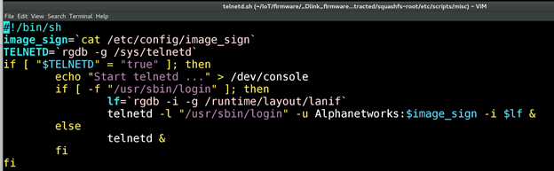 Như chúng ta có thể thấy từ tệp, nó thực sự chứa mã để đăng nhập vào phiên telnet với tên người dùng của Alphanetworks và mật khẩu là nội dung của tệp được chỉ định bởi $image_sign. Nếu chúng ta nhìn kỹ, ngay trong dòng thứ hai của tập lệnh, biến $image_sign được đề cập là nội dung của tệp /etc/config/image_sign.