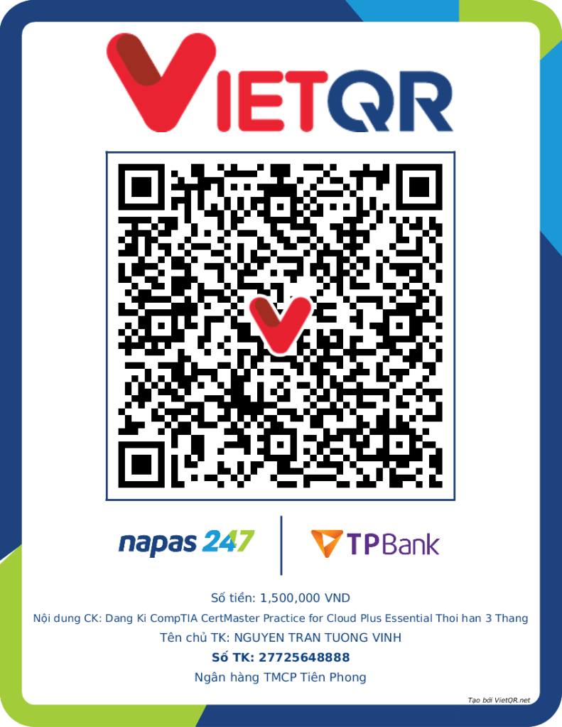Để đăng kí tài khoản CertMaster Practice for CompTIA Cloud Essentials+ (CLO-002) thời hạn sử dụng 3 tháng hãy tiến hành Thanh toán qua QR Code sau đây, sau đó chụp hình UNC gởi về Zalo 0948432780 hoặc messenger Thao Trường Mạng. Tài khoản sẽ được cấp trong vòng 24 giờ.