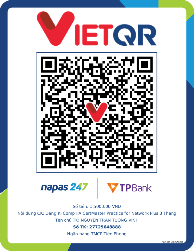 Để đăng kí tài khoản CertMaster Practice for CompTIA Network + (N10-008 hoặc N10-009) thời hạn sử dụng 3 tháng hãy tiến hành Thanh toán qua QR Code sau đây, sau đó chụp hình UNC gởi về Zalo 0948432780 hoặc messenger Thao Trường Mạng. Tài khoản sẽ được cấp trong vòng 24 giờ.