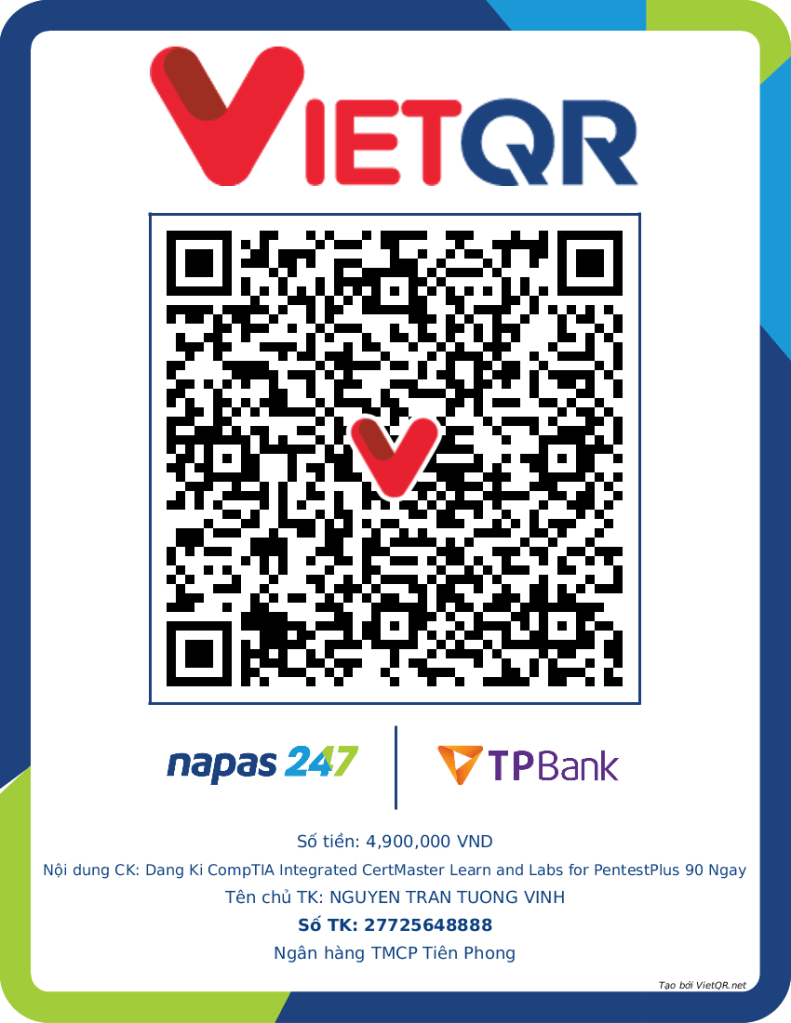 Để đăng kí Thao Trường Mạng Online CompTIA CertMaster Learn + Lab PenTest+ (PT0-002) hãy chọn gói tương ứng và quét mã QR tiến hành thanh toán, sau đó gởi hình Ủy Nhiệm Chi hay hình ảnh Chuyển Khoản về Zalo 0948432780 để nhận tài khoản hoặc messenger Thao Trường Mạng. Thời gian xử lý chậm nhất từ 8 – 24 giờ làm việc. Nhanh nhất trong vòng 60 phút.