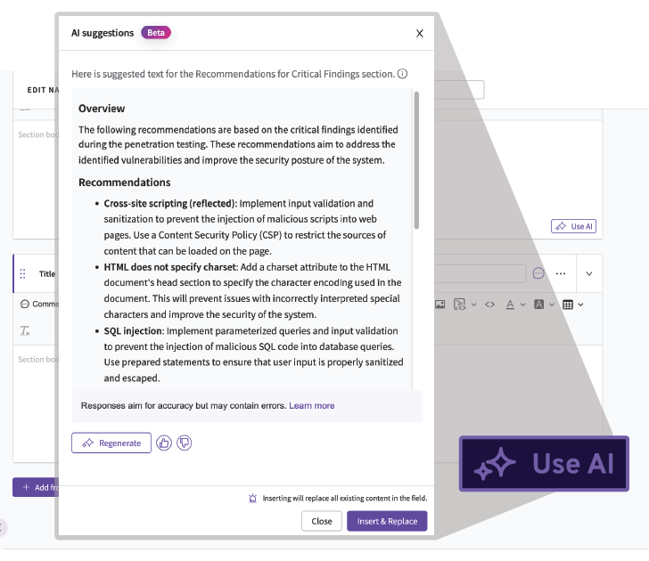 Báo cáo Kiểm thử Xâm nhập/Bảo mật Tấn công: Giống như các công cụ GPT giúp bạn viết email, bạn có thể sử dụng AI tạo sinh để tăng tốc độ viết báo cáo kiểm thử xâm nhập. PlexTrac, một nền tảng báo cáo kiểm thử xâm nhập hàng đầu, tích hợp AI để giúp tạo các phát hiện khai thác, tóm tắt dữ liệu và thậm chí soạn thảo các bản tóm tắt điều hành cho báo cáo. Nhưng, tất nhiên, bạn cần đảm bảo nền tảng bạn sử dụng giữ an toàn cho dữ liệu của bạn. Giải pháp AI tự phát triển của PlexTrac hoạt động ở chế độ được đào tạo trước. Hệ thống và các thành phần cơ bản không học hỏi theo thời gian hoặc lưu giữ các thông tin người dùng gửi vượt quá yêu cầu xử lý thông tin và cung cấp phản hồi tạo sinh.