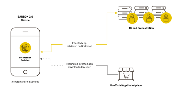 Các đối tượng đe dọa được biết là khai thác nhiều phương pháp khác nhau, từ các thỏa hiệp trong chuỗi cung ứng phần cứng đến các chợ của bên thứ ba, để phân phối những ứng dụng bề ngoài có vẻ vô hại nhưng chứa chức năng “trình tải” bí mật để lây nhiễm cửa hậu cho các thiết bị và ứng dụng này. Cửa hậu sau đó khiến các thiết bị bị nhiễm bệnh trở thành một phần của botnet lớn hơn bị lạm dụng cho gian lận quảng cáo theo chương trình, gian lận nhấp chuột và cung cấp các dịch vụ proxy dân cư bất hợp pháp :