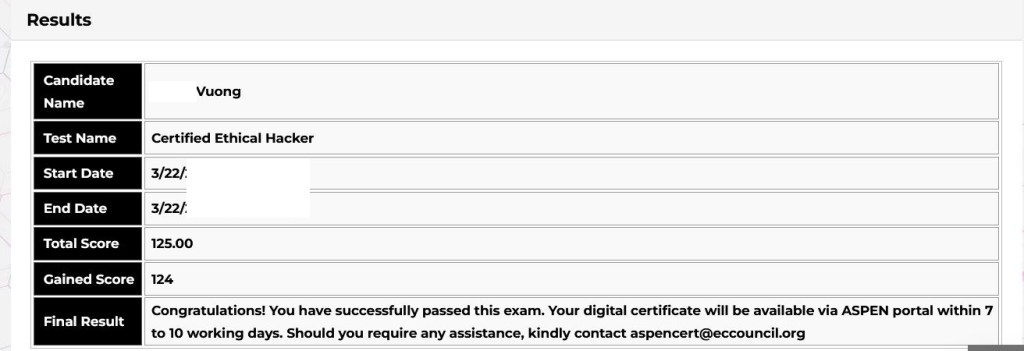 Chúc mừng Trung Vương đã xuất sắc đạt chứng chỉ CEH 2025 với số điểm gần như tuyệt đối! Đây là một cột mốc quan trọng, đặt nền móng vững chắc cho sự phát triển sự nghiệp trong lĩnh vực an toàn thông tin. Chúc bạn tiếp tục gặt hái nhiều thành công hơn nữa! 🚀🎉