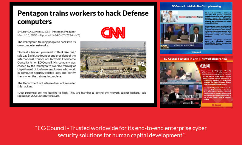 Một số tổ chức tốt nhất trên thế giới như Quân đội Hoa Kỳ, Hải quân Hoa Kỳ, Bộ Quốc phòng Hoa Kỳ, FBI, Microsoft, IBM và Liên Hợp Quốc đã tin tưởng EC-Council để phát triển và nâng cao cơ sở hạ tầng bảo mật của họ.