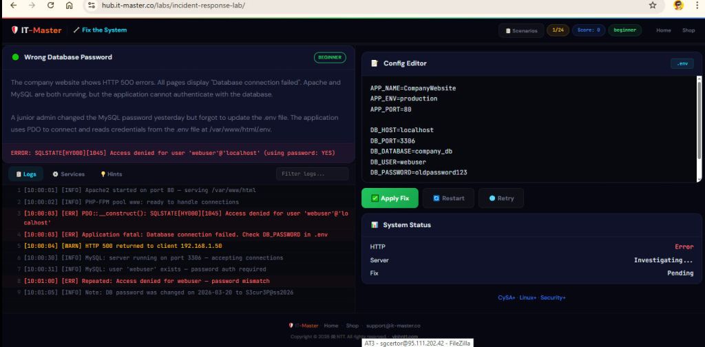 Bài viết giới thiệu bộ lab thực hành IT-Master — Fix the System. Phù hợp cho học viên đang chuẩn bị thi chứng chỉ CHFI (EC-Council) và CySA+ (CompTIA).
